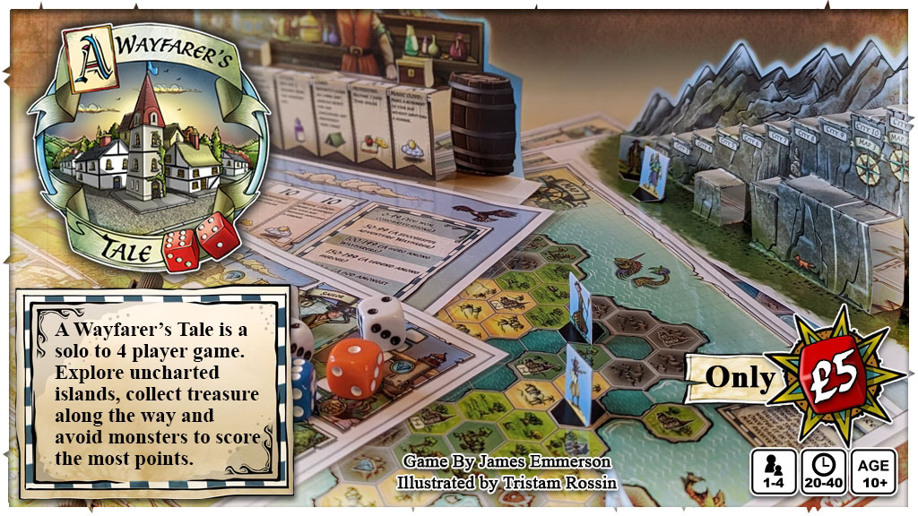 A Wayfarer's Tale, is a Solo to 4 player game where you explore uncharted islands, collecting Treasure while avoiding Monsters.